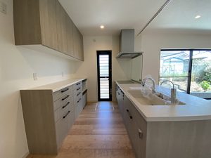 キッチンの後ろにはたくさんの収納を設けて